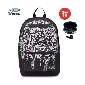 Earphones wireless con luci led, microfono integrato e custodia con base di ricarica. Zaino reversibile tramite cerniera: un lato in fantasia, l'altro in tinta unita da personalizzare con i tre marker abbinati allo zaino.